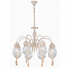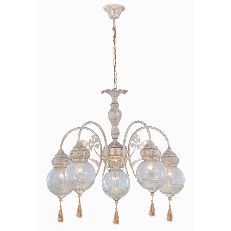 Эту люстру наилучшим образом использовать в интерьере в стиле восток. Арматура из металла, цвет золотой, подвески золотые, плафоны прозрачные из стекла. Люстра обладает степенью защиты IP20.