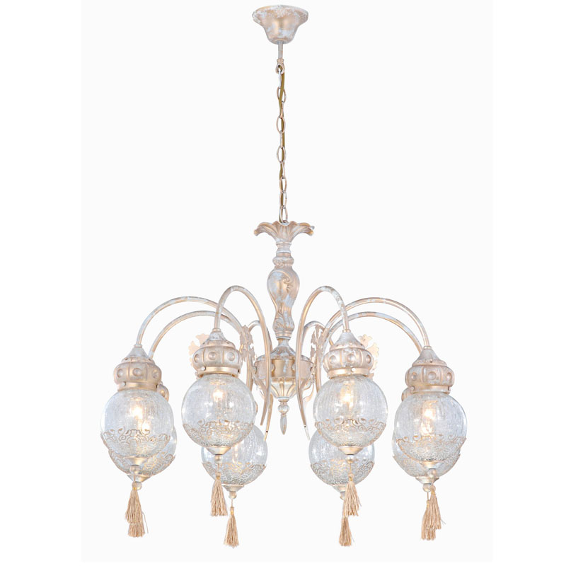 Люстру установить в помещении,выдержанном в стиле восток. Арматура из металла, цвет золотой, подвески золотые, плафоны прозрачные из стекла. Люстра обладает степенью защиты IP20.