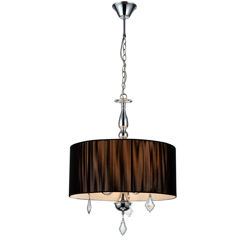 Эту люстру установить в комнате,выдержанном в стиле модерн. Основание из металла, цвет хромированный, подвески прозрачные, плафоны черные из текстиля. Люстра имеет степень защиты от воды IP20.