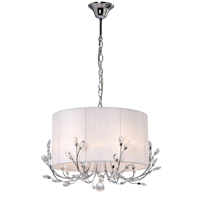 Данную люстру наилучшим образом установить в интерьере,выполненном в стиле классика. Каркас из металла, цвет хромированный, подвески прозрачные, плафоны белые из текстиля. Светильник обладает степенью защиты IP20.
