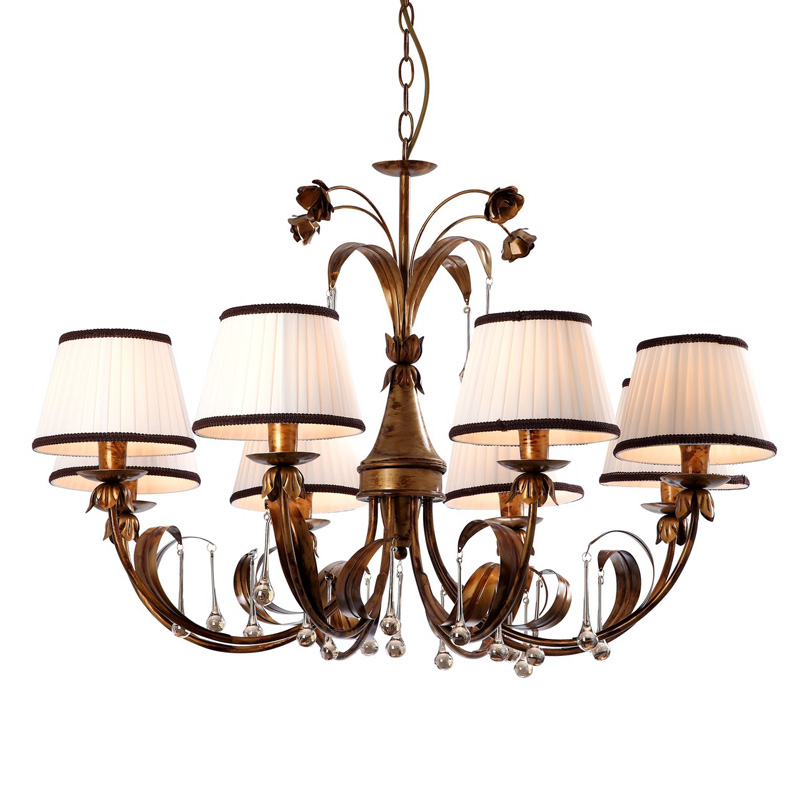 Данную люстру использовать в помещении в стиле классика. Арматура из металла, цвет коричневый, подвески прозрачные, плафоны белые из текстиля. Светильник имеет степень защиты IP20.