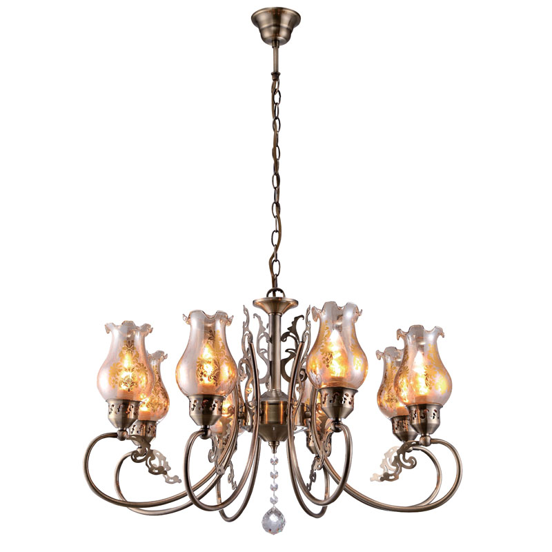Данный осветительный прибор хорошо использовать в комнате,выдержанном в стиле классика и кантри. Каркас из металла, цвет бронзовый, подвески прозрачные, плафоны коричневые из стекла. Люстра имеет степень защиты IP20.