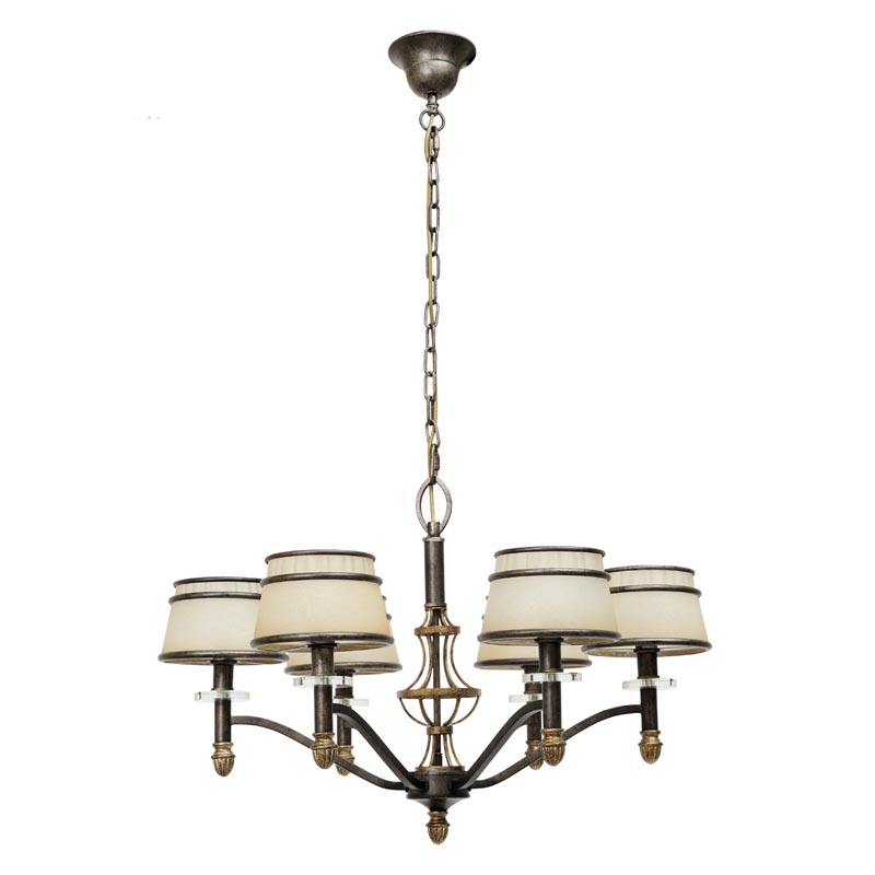 Люстру идеально установить в помещении,выполненном в стиле классика и кантри. Основание из металла, цвет бронзовый и коричневый, подвески прозрачные, плафоны бежевые из стекла. Люстра обладает степенью защиты IP20.