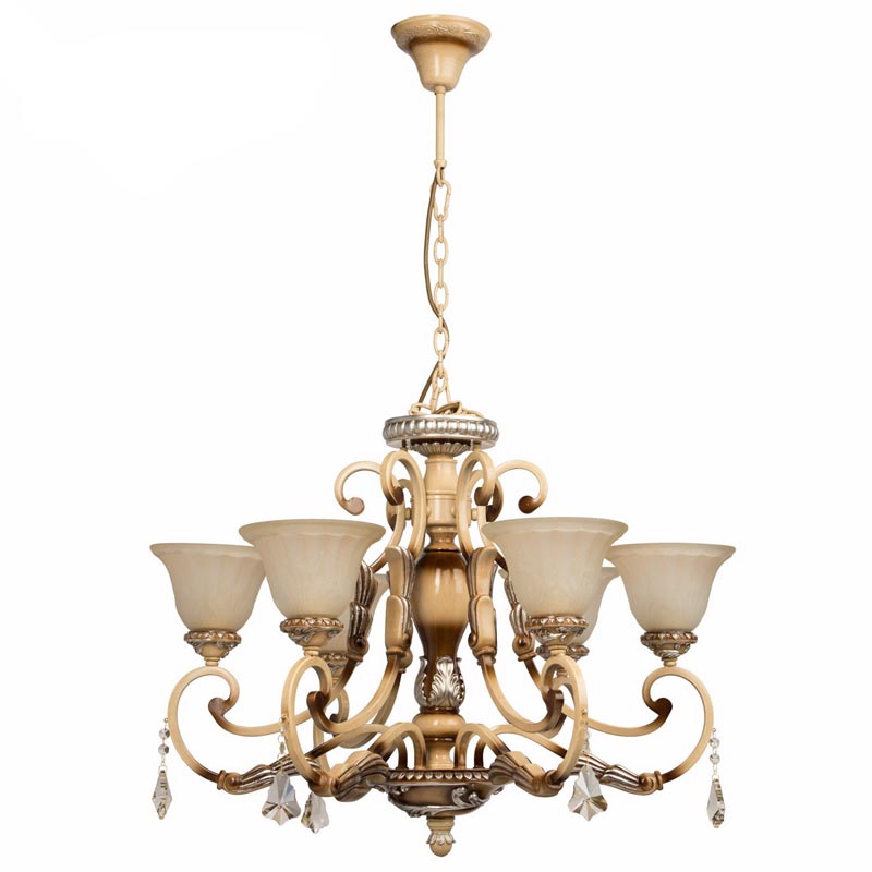 Осветительный прибор идеально установить в интерьере,выполненном в стилистике классика и прованс. Каркас из металла, цвет бежевый, коричневый и серебристый, подвески прозрачные, плафоны белые из стекла. Люстра обладает степенью защиты IP20.