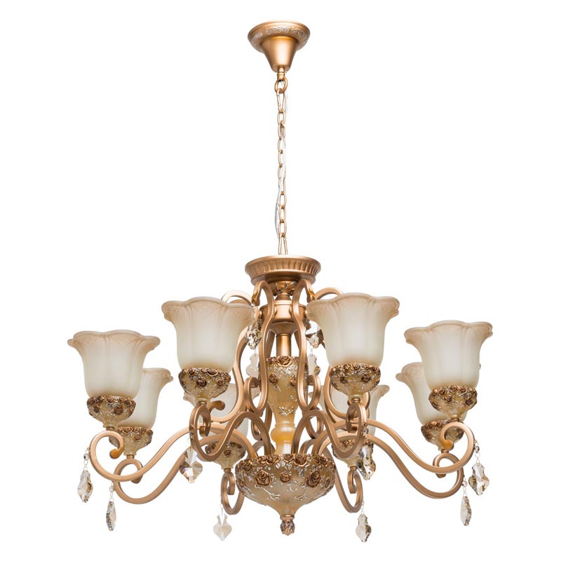 Этот осветительный прибор оптимально использовать в интерьере,выполненном в стилистике классика и прованс. Основание из металла, цвет бежевый и золотой, подвески прозрачные, плафоны белые из стекла. Люстра имеет защиту IP20.