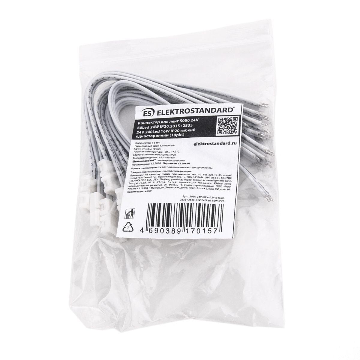 Характеристики Набор гибких коннекторов односторонний для светодиодной ленты Elektrostandard 5050 24V 60Led 24W IP20 (10 шт) 4690389170157
