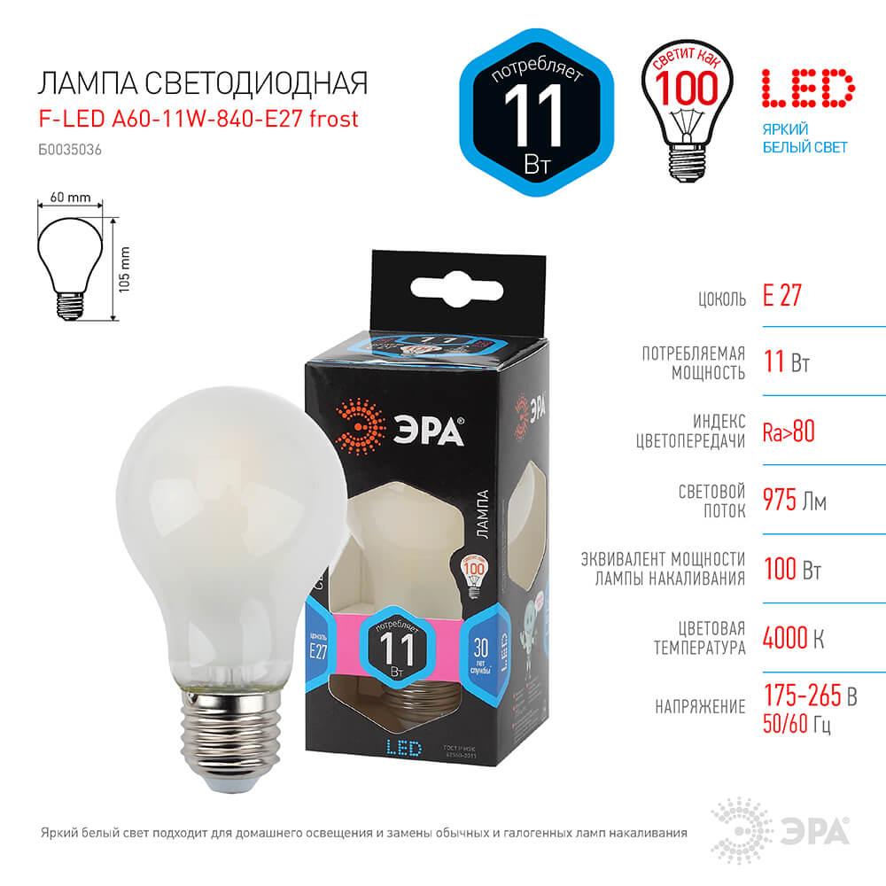 Характеристики Лампа филаментная ЭРА F-LED A60-11W-840-E27 frost