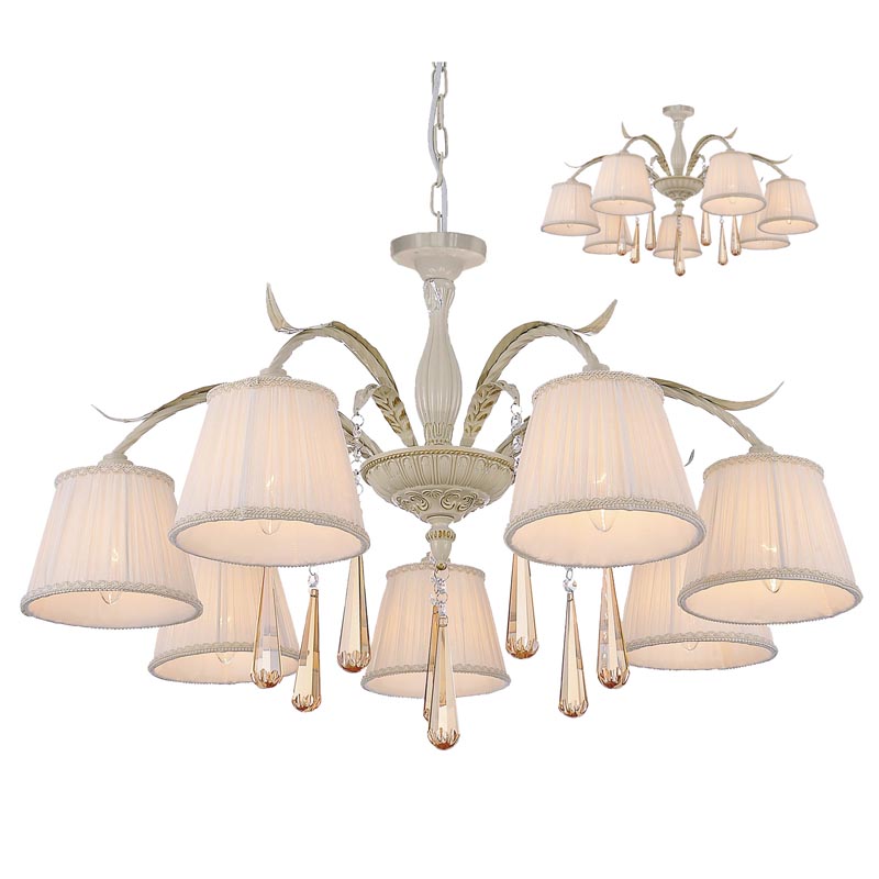 Эту люстру наилучшим образом использовать в интерьере,выполненном в стиле классика и прованс. Каркас из металла, цвет золотой и белый, подвески желтые, плафоны белые из текстиля. Светильник имеет защиту от воды IP20.