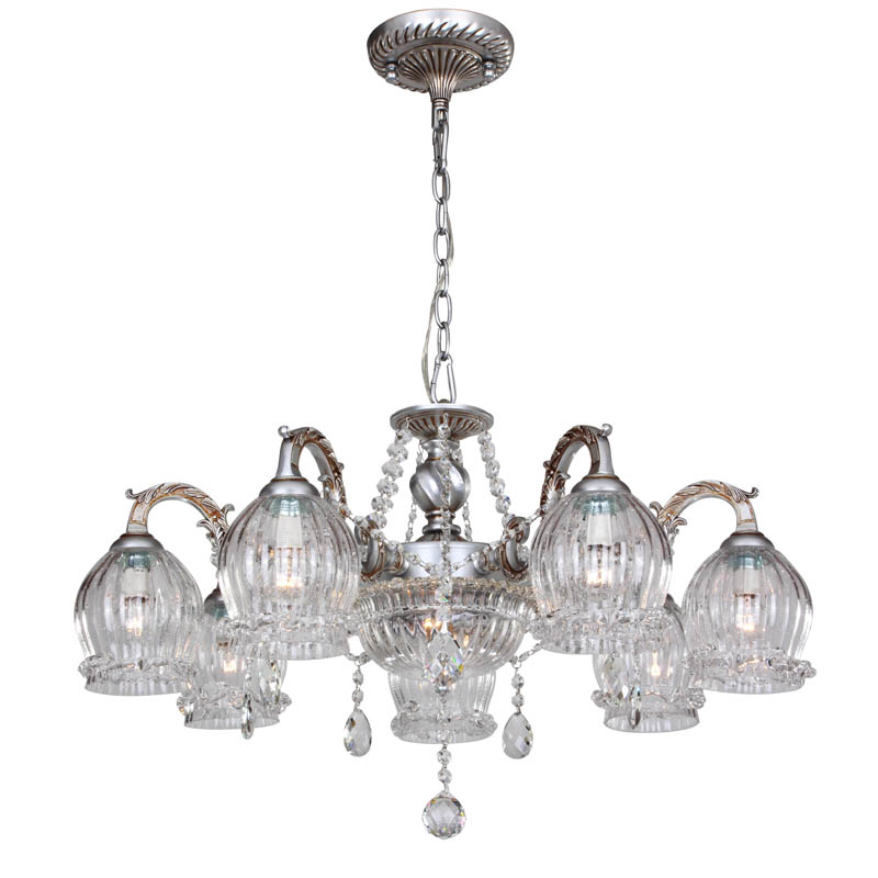 Данную люстру превосходно использовать в интерьере,выполненном в стиле классика. Основание из металла, цвет серебристый и золотой, подвески прозрачные, плафоны прозрачные из стекла. Светильник имеет степень защиты от воды IP20.