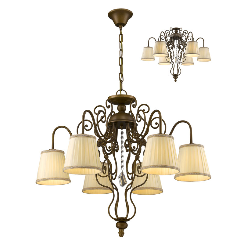 Эту люстру идеально использовать в комнате,выполненном в стилистике классика и прованс. Каркас из металла, цвет коричневый, подвески прозрачные, плафоны белые из текстиля. Люстра имеет степень защиты от воды IP20.