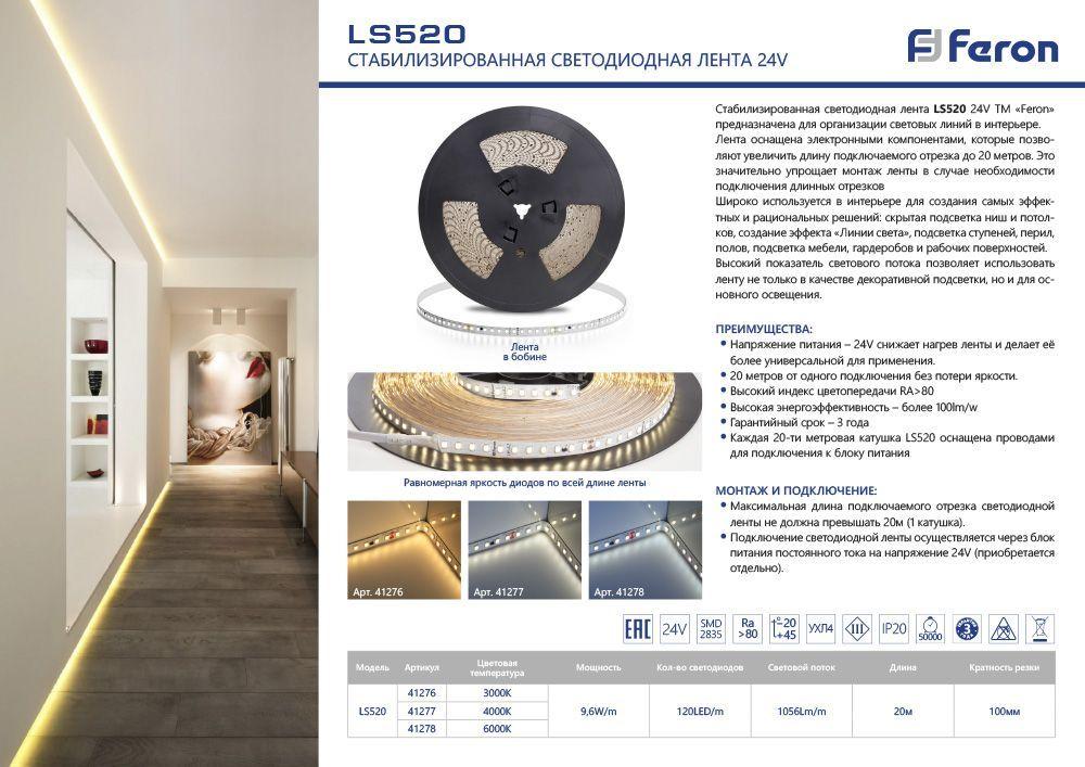 Характеристики Светодиодная лента Feron 9,6W/m 120LED/m 2835SMD холодный белый 20M LS520 41278