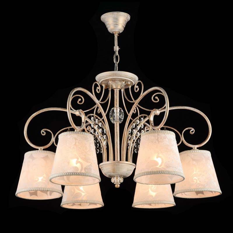 Данную люстру превосходно подвесить в помещении в стилистике классика. Арматура из металла и стекла, цвет белый, золотой и прозрачный, подвески прозрачные, плафоны белые из текстиля. Люстра обладает степенью защиты IP20.