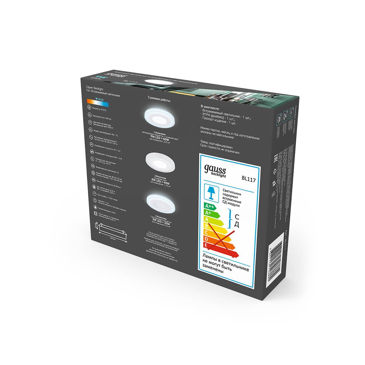 Характеристики Точечный светильник встраиваемый светодиодный Gauss BL117