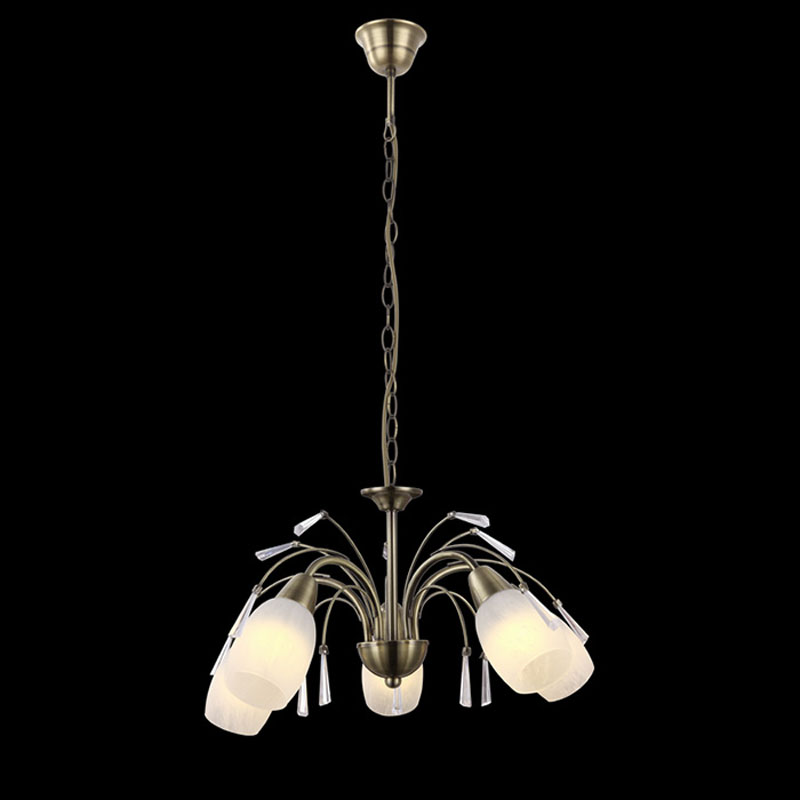 Этот осветительный прибор идеально использовать в интерьере,выполненном в стилистике классика и модерн. Основание из металла, цвет бронзовый, подвески прозрачные, плафоны белые из стекла. Светильник обладает степенью защиты от воды IP20.