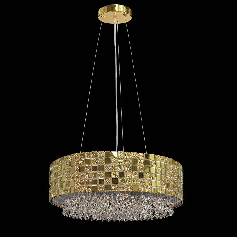 Люстру установить в комнате, выдержанном в стилистике модерн. Арматура из металла, цвет золотой, подвески прозрачные, плафоны золотые из стекла. Светильник обладает степенью защиты от воды IP20.