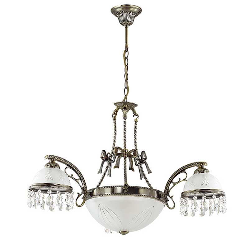 Данный осветительный прибор превосходно использовать в помещении, выдержанном в стилистике классика. Основание из металла, цвет бронзовый, подвески прозрачные, плафоны белые из стекла. Люстра имеет защиту IP20.