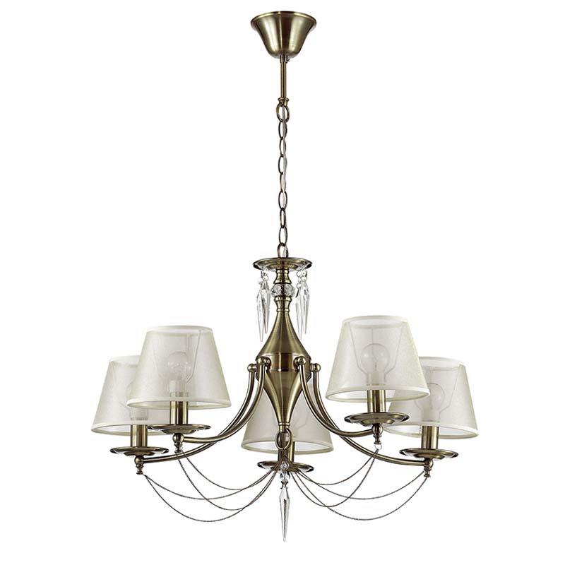 Люстру наилучшим образом установить в помещении,выдержанном в стиле модерн. Арматура из металла, цвет бронзовый, подвески прозрачные, плафоны белые из текстиля. Светильник имеет защиту от воды IP20.