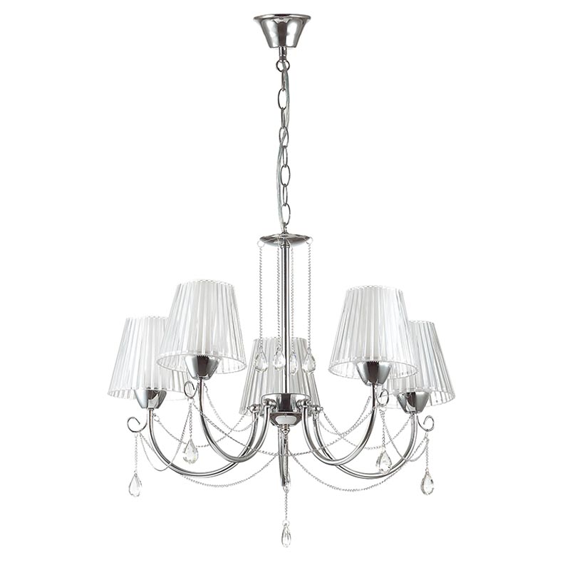 Этот осветительный прибор хорошо подвесить в интерьере,выполненном в стиле модерн. Арматура из металла, цвет хромированный, подвески прозрачные, плафоны белые из пластика. Светильник имеет степень защиты от воды IP20.