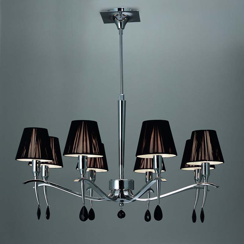 Красивая подвесная люстра mn 0341 из серии VIENA - SHADE - CHROME от проверенного временем испанского производителя Mantra станет центральным акцентом для спальни, для гостиной или для кухни. Данная модель в высоту 600-780 мм, а диаметр 750 мм общее количество лампочек 8 штук, эта модель великолепно подойдет для площади до 44 кв.м. Общая мощность ламп может быть до 320 вт, под патрон E14.