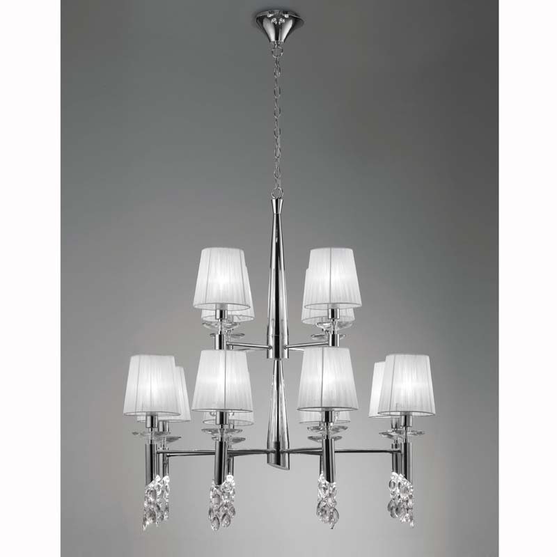 Красивая подвесная люстра mn 3850 из серии TIFFANY CHROME от популярного испанского производителя Mantra будет изящным украшением для спальни, для гостиной или для кухни. Данная модель в высоту 1500-1730 мм, а диаметр 850 мм общее число лампочек 12 + 12 штук, благодаря чему данный светильник идеально подойдет для помещения до 92.4 кв.м. Общая мощность лампочек может быть до 240 вт, они вкручиваются в цоколь E14 и G9.