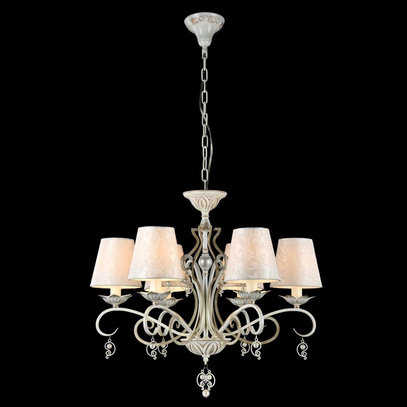 Данную люстру отлично подвесить в интерьере в стиле классика и прованс. Каркас из металла, цвет белый и золотой, подвески прозрачные, плафоны белые из текстиля. Светильник обладает степенью защиты IP20.