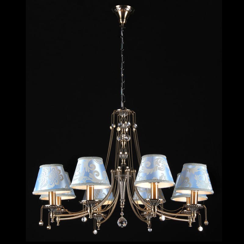 Данную люстру идеально использовать в помещении,выдержанном в стиле классика. Каркас из металла, цвет бронзовый, подвески прозрачные, плафоны голубы из текстиля. Светильник имеет защиту IP20.