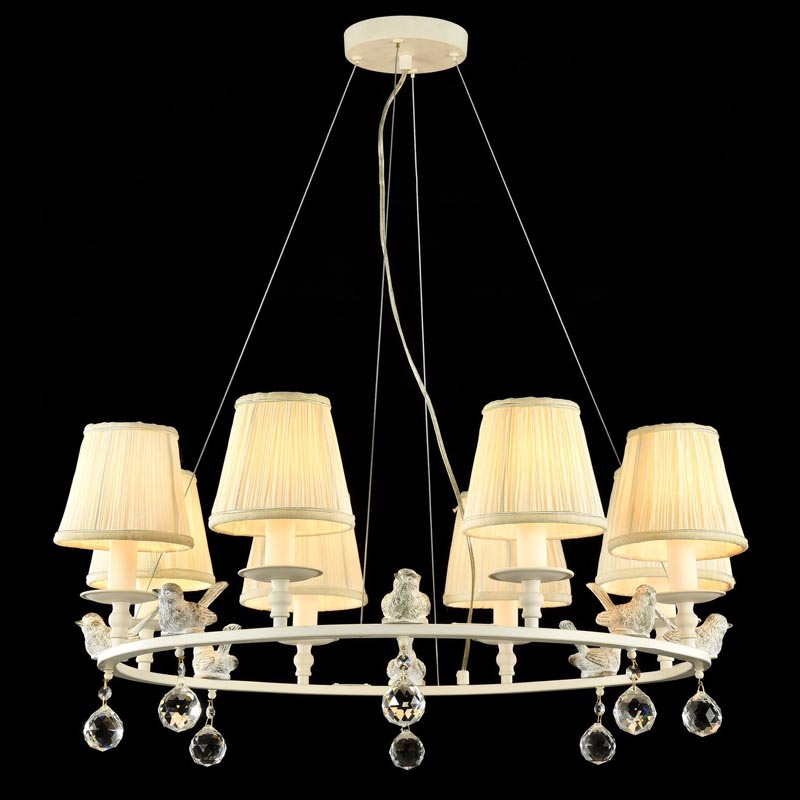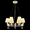 Данный осветительный прибор отлично подвесить в комнате, выдержанном в стилистике прованс. Основание из металла, цвет белый, подвески прозрачные, плафоны бежевые из текстиля. Светильник имеет защиту IP20.