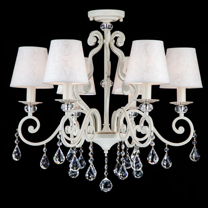 Данный осветительный прибор оптимально установить в интерьере,выдержанном в стиле классика и прованс. Основание из металла, цвет белый и золотой, подвески прозрачные, плафоны белые из текстиля. Светильник имеет степень защиты от воды IP20.