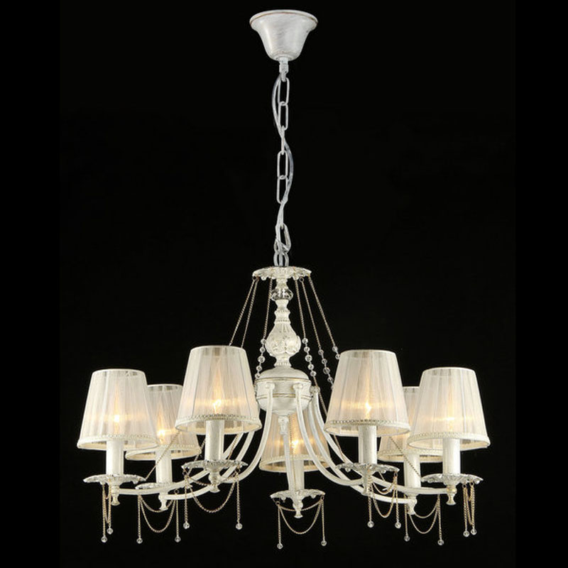 Эту люстру великолепно использовать в помещении,выдержанном в стиле прованс и классика. Арматура из металла, цвет белый, подвески прозрачные, плафоны белые из текстиля. Люстра обладает степенью защиты от воды IP20.