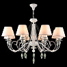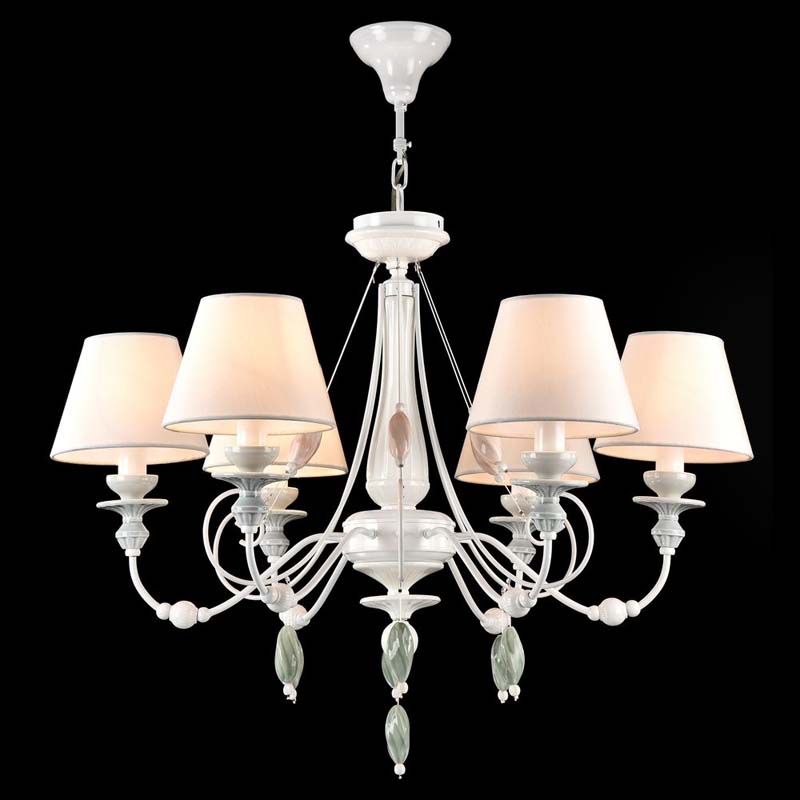 Эту люстру отлично установить в интерьере в стиле классика. Арматура из металла, цвет белый, подвески белые, плафоны белые из текстиля. Люстра имеет защиту от воды IP20.