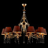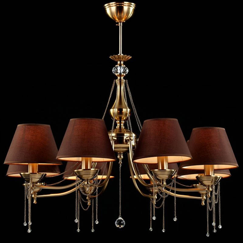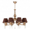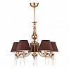 Люстру великолепно установить в комнате, выдержанном в стилистике классика. Арматура из металла, цвет золотой, подвески прозрачные, плафоны коричневые из текстиля. Светильник имеет степень защиты IP20.