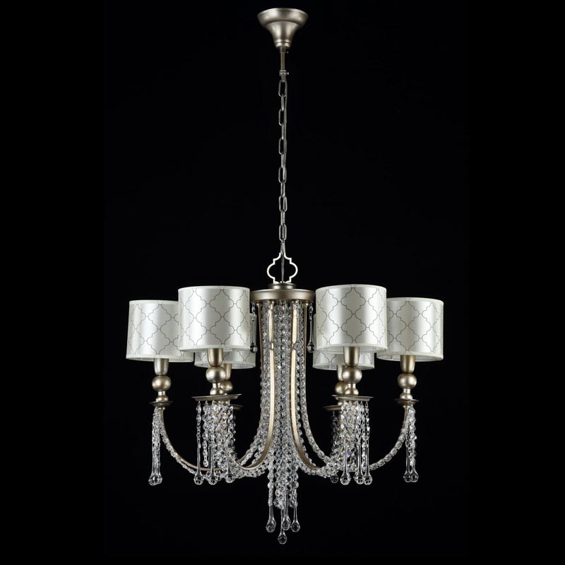Люстру установить в комнате в стилистике модерн. Каркас из металла, цвет золотой, подвески прозрачные, плафоны белые из текстиля. Люстра имеет защиту IP20.