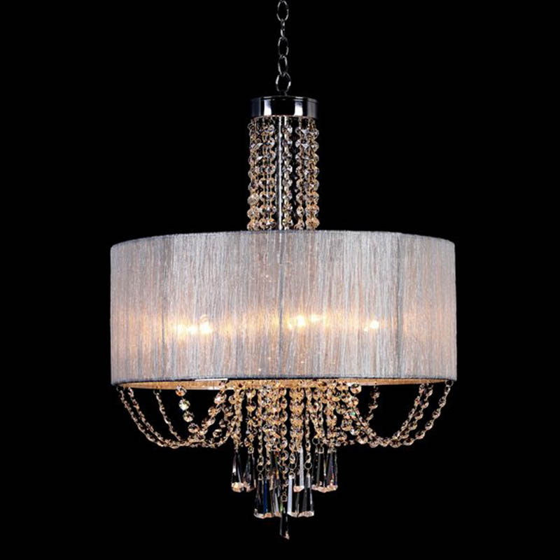 Осветительный прибор использовать в помещении в стилистике классика и модерн. Каркас из металла, цвет хромированный, подвески прозрачные, плафоны белые из текстиля. Люстра обладает степенью защиты от воды IP20.