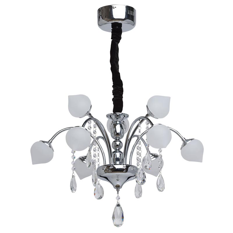 Осветительный прибор превосходно использовать в интерьере в стилистике модерн. Каркас из металла, цвет хромированный, подвески прозрачные, плафоны белые из пластика. Светильник имеет степень защиты от воды IP20.