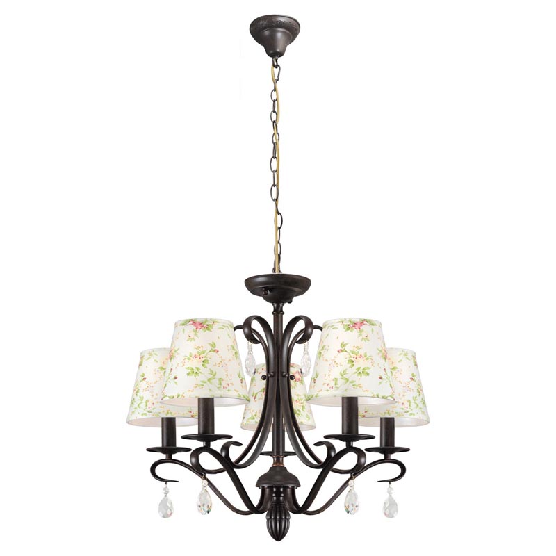 Данную люстру хорошо использовать в помещении,выдержанном в стиле классика и прованс. Арматура из металла, цвет коричневый, подвески прозрачные, плафоны белые и многоцветные из текстиля. Люстра обладает степенью защиты IP20.