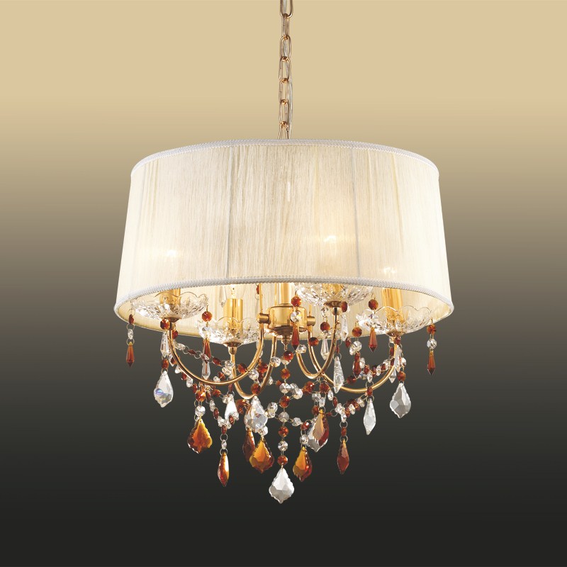 Люстру использовать в интерьере,выполненном в стиле классика. Основание из металла, цвет золотой, подвески прозрачные и янтарные, плафоны белые из текстиля. Светильник обладает степенью защиты от воды IP20.