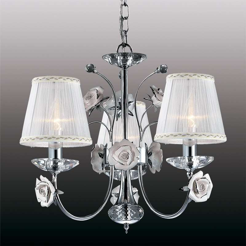 Данный осветительный прибор установить в помещении,выдержанном в стиле классика и флористика. Арматура из металла, цвет хромированный, подвески прозрачные, плафоны белые из текстиля. Светильник имеет степень защиты IP20.