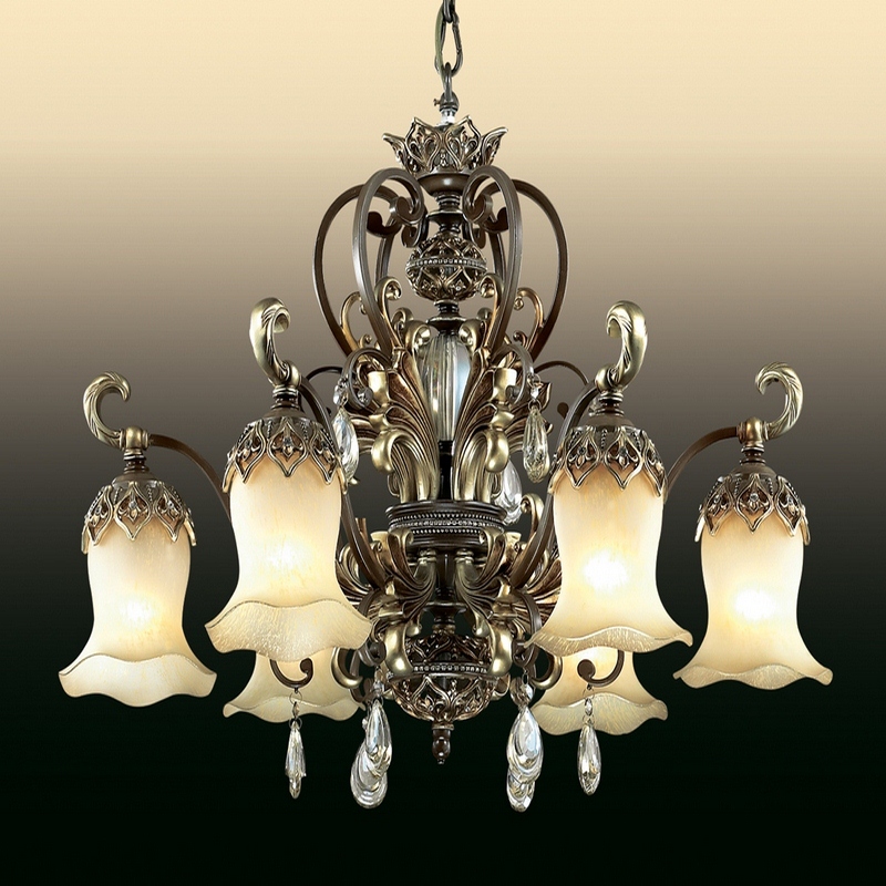 Этот осветительный прибор наилучшим образом использовать в интерьере,выполненном в стилистике классика. Основание из металла и полимерного материала, цвет коричневый и золотой, подвески прозрачные, плафоны бежевые из стекла. Люстра имеет защиту от воды IP20.