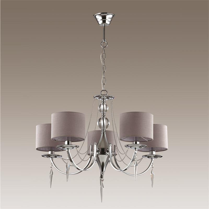 Эту люстру отлично установить в комнате,выполненном в стилистике модерн и классика. Арматура из металла, цвет хромированный, подвески прозрачные, плафоны бежевые и коричневые из текстиля. Светильник обладает степенью защиты от воды IP20.