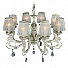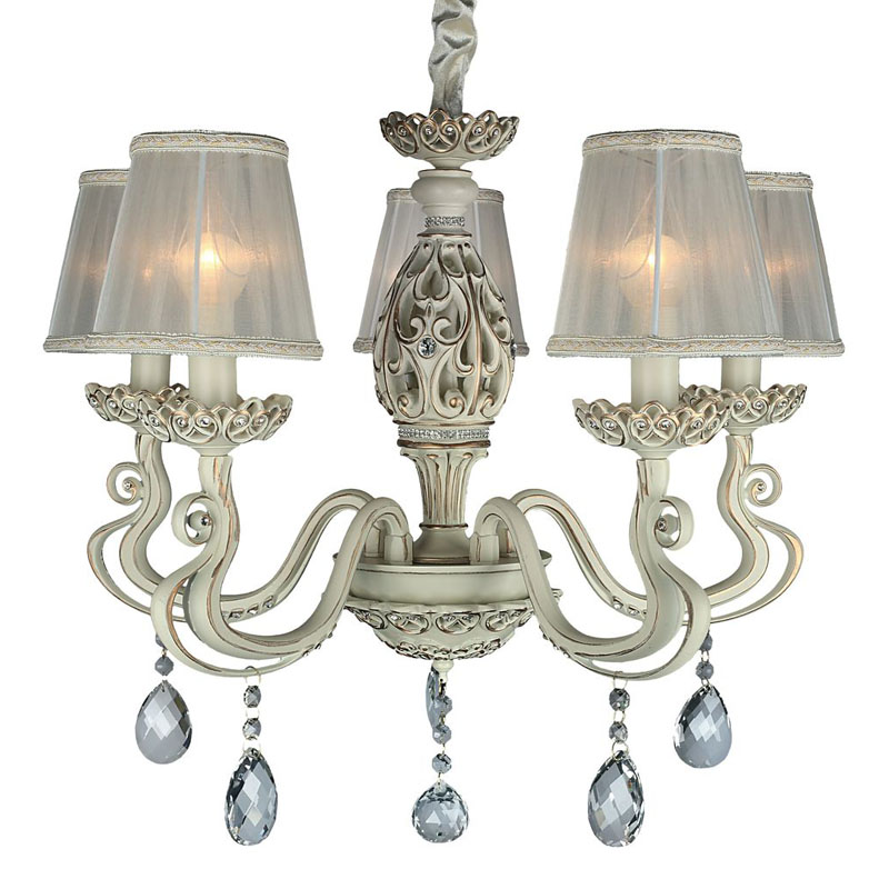 Эту люстру великолепно установить в интерьере,выполненном в стиле классика и прованс. Арматура из металла, цвет бежевый и золотой, подвески прозрачные, плафоны белые из текстиля. Светильник имеет защиту IP20.