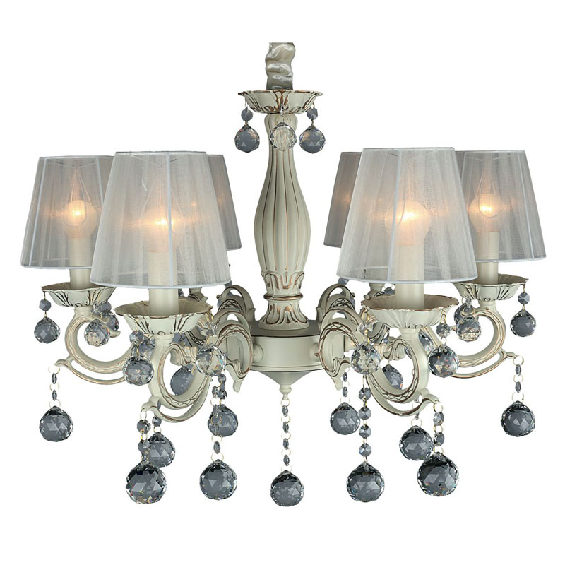 Осветительный прибор превосходно подвесить в помещении,выполненном в стиле классика и прованс. Арматура из металла, цвет бежевый и золотой, подвески тонирующие, плафоны белые из текстиля. Светильник имеет степень защиты от воды IP20.