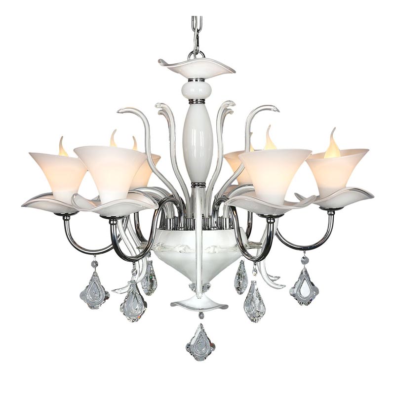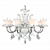 Осветительный прибор наилучшим образом использовать в интерьере,выдержанном в стиле классика и флористика. Основание из металла, цвет белый, подвески прозрачные, плафоны белые из стекла. Светильник имеет степень защиты от воды IP20.