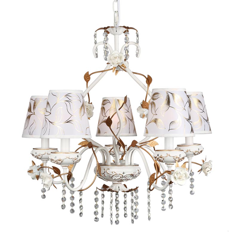 Люстру подвесить в помещении,выполненном в стилистике классика и прованс. Каркас из металла, цвет белый и золотой, подвески прозрачные, плафоны белые и золотые из текстиля. Люстра имеет степень защиты от воды IP20.