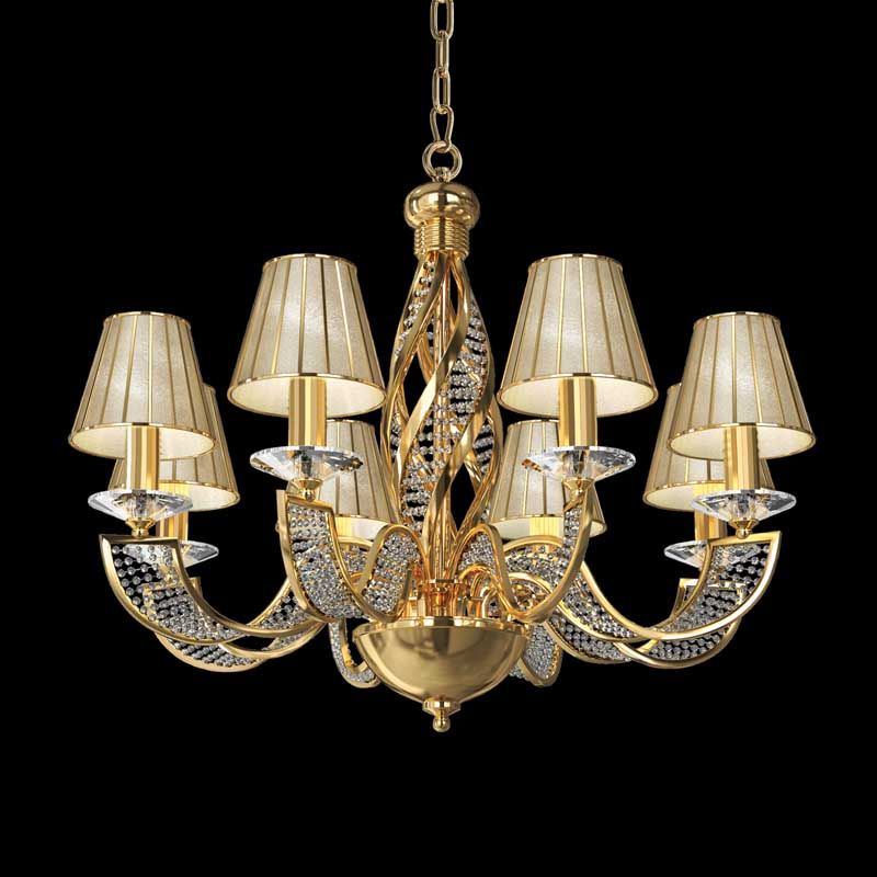 Данную люстру наилучшим образом установить в интерьере, выдержанном в стилистике классика. Арматура из металла и стекла, цвет золотой, подвески прозрачные, плафоны белые из текстиля. Люстра имеет защиту от воды IP20.