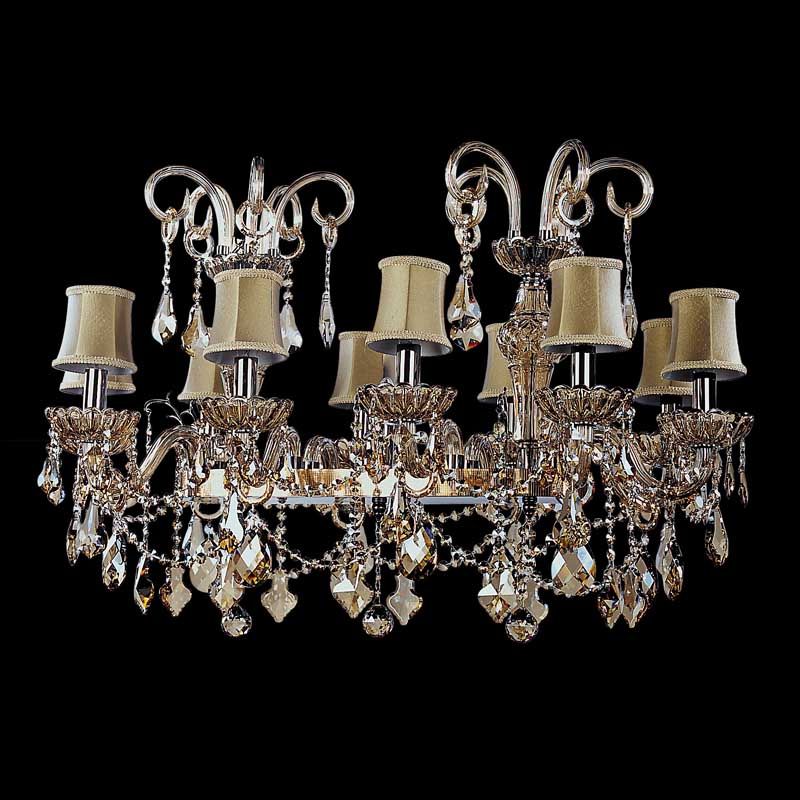 Эту люстру великолепно подвесить в помещении, выдержанном в стилистике классика. Каркас из металла и стекла, цвет коричневый и золотой, подвески коньячные, плафоны бежевые из текстиля. Люстра обладает степенью защиты от воды IP20.